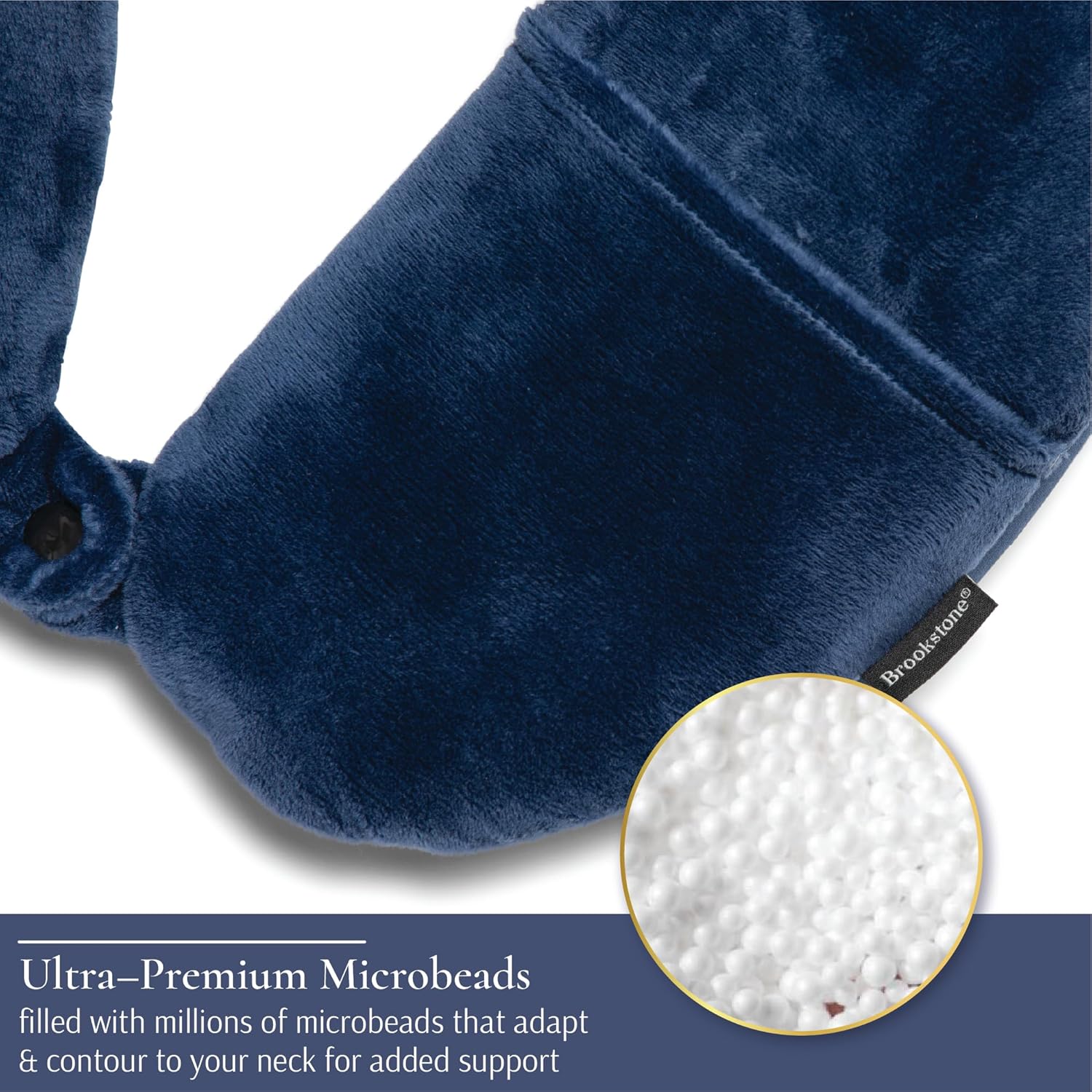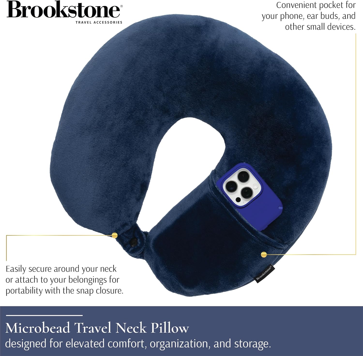 Brookstone Microbead Travel Head and Neck Pillow Lightweight and Plush with Phone or Headphone Pocket, Blue
